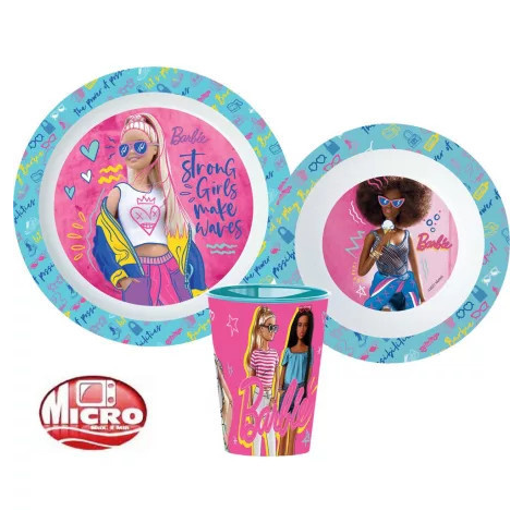 Barbie étkészlet, micro műanyag szett -BPA Mentes -Származási ország: Spanyolország -A termék környezetbarát, újrahasznosítható anyagból készült a Föld védelmében. Csomagolás nélkül! A készlet tartalma: 1 db mélytálka (Mikrózható műanyag) 1 db lapostán