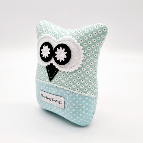 Bagoly Levendulás Álompárna Méret: kicsi (10 cm széles × 13 cm magas) Anyaga: menta zöld alapon, fehér mintás pamutvászon, halvány türkisz kék színű pöttyös mintás pamutvászon, szeme, orra dekorfilc Töltet: 100 % poliészter, levendula Tisztítás: 30°-on kí