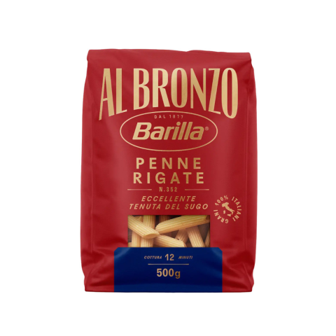 Összetétel: durumbúza, víz A Barilla Al Bronzo Penne tollhegy tészta 100% olasz durumbúzából készül, borostyánsárga színű. A 'bronz' eljárásnak köszönhetően az Al Bronzo tészták felülete érdesebb, ennek köszönhetően jobban tapadnak rá a szószok, mártások,