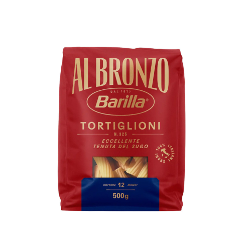 Összetétel: durumbúza, víz A Barilla Al Bronzo Tortiglioni csőtészta 100% olasz durumbúzából készül, borostyánsárga színű. A 'bronz' eljárásnak köszönhetően az Al Bronzo tészták felülete érdesebb, ennek köszönhetően jobban tapadnak rá a szószok, mártások,