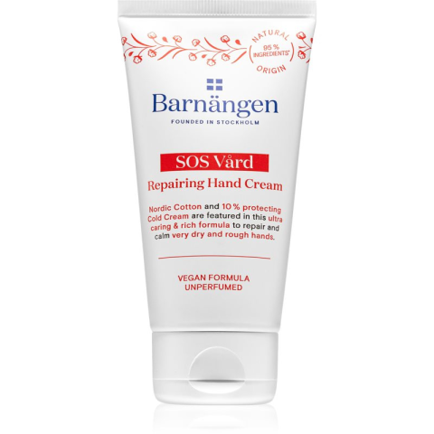 Kézkrém - tápláló és bőrpuhító, vegán, száraz bőrre ajánlott, száraz bőrre alkalmas, parabénmentes és szulfátmentes, mindennapi használatra, hatóanyaga: napraforgóolaj és pamut kivonat, frissítő illattal, 75 ml-es kiszerelésben Krém na ruce Barnängen SOS Vard je určen pro intenzivní péči o suchou a namáhanou pokožku rukou. Poskytuje hydrataci, regeneraci a ochranu před vysušováním, přitom se snadno vstřebává a nezanechává tě
