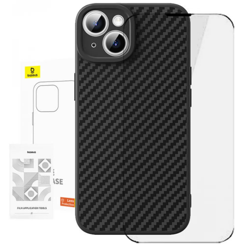 1 kép Baseus Synthetic Fiber hátlaptok + edzett üveg iPhone 15 Plus fekete