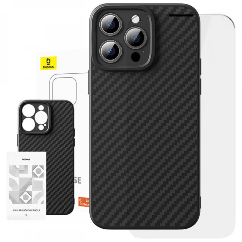 1 kép Baseus Synthetic Fiber hátlaptok + edzett üveg iPhone 15 Pro fekete