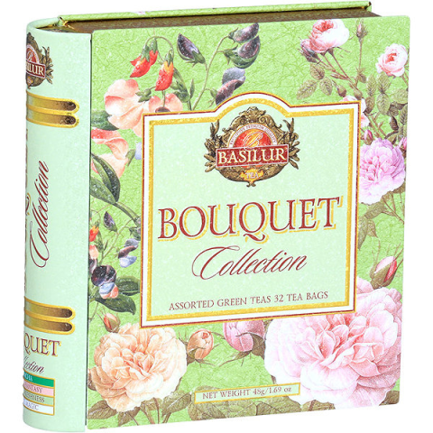 Tea - zöld, teakeverék, tömege 48 g BASILUR Book Assort 32 Bouquet fémdoboz48 g (32× 1,5 g)A Basilur Book Assorted 32 Bouquet ajándékdoboz elegáns, könyv alakú fémdobozban kínál változatos válogatást aromásított teakeverékekből a minden