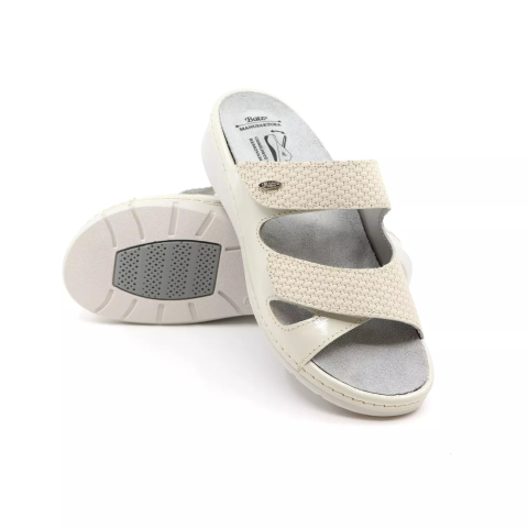 Batz Sorrento női papucs törtfehér színben. Remekül kihasználható, letisztult szín, mely mindennel kombinálható. Az anatómiai kialakítás gondoskodik lábaid egésznapos jóllétéről, és állítható tépőzáras pánt segít abban, hogy teljesen saját igényeidre szabhasd a papucsot. Cserélhető, kivehető talpbetétes, szuperkényelmes lábbeli, mely a korszerű elvárásokhoz igazodik, de ha igazán luxusra vágysz egyedi