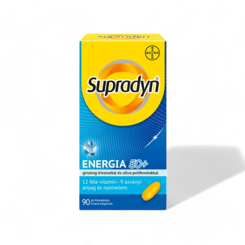 Supradyn Energia 50+ filmtabletta kifejezetten az idősebb (50 év feletti) korosztály számára összeállított készítmény. A benne található B2-, B6-, és C-vitamin, valamint a folát a magnézium és a vas hozzájárulnak a fáradtság és a kifáradás csökkentéséhez.