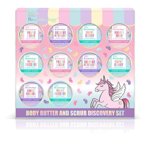 Kozmetikai ajándékcsomag - 5 x 50 ml testradírt, 5 x 50 ml testvajat tartalmaz A BAYLIS & HARDING ajándékcsomag főbb jellemzői5 testápoló vaj és 5 testradír ajándékcsomag a finom, selymes és rugalmas bőrért, édes édességek, epres bonbonok és vattacukor illatával. Tartal