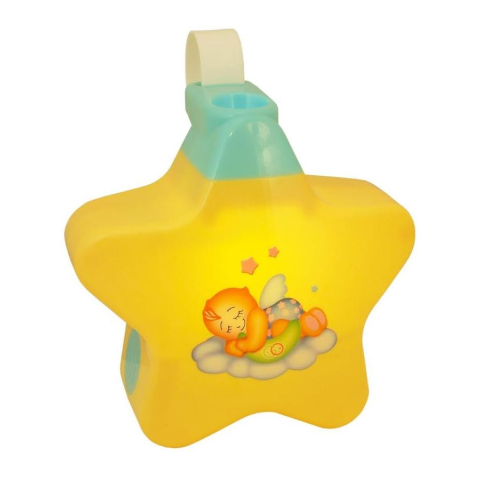 Zenélő projektoros kisbabák számára. Csillag alakű. Csilag és maci képeket vetít, és dallamokat játszik. 2 fokozatú hangerő szabályzóval. Külön gombbal rendelkezik a dallamokra és a képek vetítésére. Minőségi műanyagból készült. 0- hónapos kortól ajánlott. Az elemek nem a csomagolás része. Mérete kb 15x15 cm.