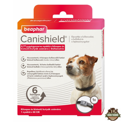 Canishield S/M gyógyszeres nyakörv kutyáknak Ismerje meg a Beaphar Canishield® nyakörvet! A Beaphar Canishield® hatóanyaga, a deltametrin fokozatosan szabadul fel a nyakörvet alkotó polimer mátrixból és a kutya testfelületét borító lipidrétegen keresz