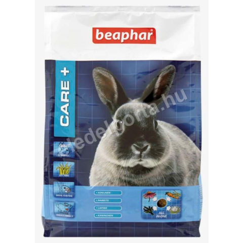 A Care+ Nyúl eledelben a különlegesleges gyártási folyamat (a nagy nyomás és a magas hőmérséklet ) következtében a fehérjék könnyen emészthetőek, a táplálék tiszta és egészséges az alapanyagokban jelen lévő kórokozó baktériumok, penész és vírusok elpusztítása révén. Mivel a táplálék minden egyes extrudált darabja azonos összetevőkből áll, megelőzhető az egyoldalú takarmányozás, s biztosítva lesz, hogy az összes szükséges beltartalom elfogyasztásra kerül. A Care+ Nyúleledel megfelelő kalcium/foszfor arányt biztosít az egészséges növekedéshez. A termékben lévő fehérjék gazdagok az izomfejlődéshez szükséges alapvető aminosavakban. A Care+ alacsony zsírtartalmú, megfelelő arányban tartalmaz Omega 6 és Omega 3 zsírsavakat. Természetes összetevők (Echinacea, Spirulina-alga, és Yucca Schidigera) kerülnek hozzáadásra és az eledelben lévő ásványok fehérjeburka segíti azok felszívódását. A szintén hozzáadott FOS*, ill. MOS** az egészséges bélflóra fenntartásában segít. *FOS- frukto-oligoszacharid ** MOS – mannan-oligoszacharid Összetevők: gabonafélék, növényi származékok (pl. mannan oligoszacharid, frukto-oligoszacharid), zöldségfélék, ásványi anyagok, magvak, élesztők, algák. Beltartalom: Nedvesség: 9,2%; Nyersfehérje: nyersrost: 22%; 16%; nyerszsír: 3,2%; hamu: 5,6%; Ca: 0,75%; Mg: 0,30%; Na: 0,20%; K: 1,10%; P: 0,44%; A vitamin: 13,100 IE/kg; D3 vitamin: 1,450 IE/kg; E vitamin: 87,1 mg/kg (50%-ban D-alfa-tokoferol acetát formában); Cu: 12,6 mg/kg (réz-aminosav kelát és réz(II) oxid formában), DL-metionin 1040 mg/kg; Yucca Schidigera min. 0,2%, Echinacea min 0,05%, Spirulina min. 0,01% Nettó tömeg: 1500 g. Takarmányozási javaslat: A nyulaknak egész nap szükségük van hozzáférhető táplálékra, mert tápcsatornájuknak mindig tele kell lennie. Az első napokban célszerű jobban figyelni a fogyasztásukat és szükség esetén a korábbi táplálékkal vegyesen etetni őket. A nyulak által elfogyasztott táplálék mennyisége nagyban függ az állat méretétől. Mindig annyit adjunk nekik, amennyi elfogy. Maradékok esetén csökkentsük a napi adagot az ideális mennyiség eléréséig. Általános iránymutatónak a következőket tekinthetjük: kistestű nyulak (mini sarki, holland törpe kb. 60 g; holland lógó fülű kb. 85 g ; rex kb. 115 g ; óriás nyulak (francia lógó fülű, flamand óriás, belga) kb. 170-450 g; Angol óriás kb. 340-450 g naponta. Minden nap friss eledelt és ivóvizet kell adni nekik és friss szénát korlátlanul kell biztosítani.