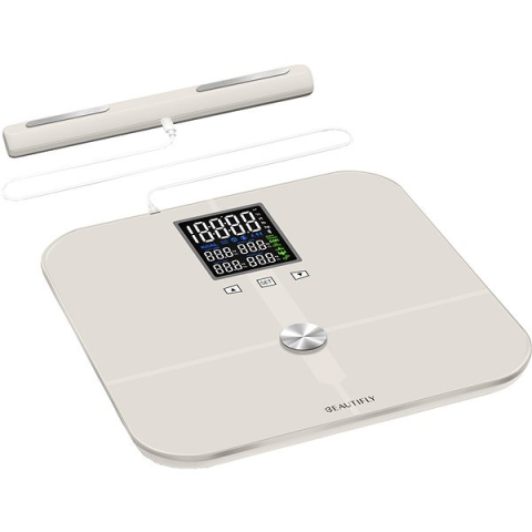 Személymérleg - digitális diagnosztikai, okos, terhelhetőség 180 kg, testzsír mérés, izomtömeg mérés, lehetőség okostelefonhoz csatlakoztatásra, felhasználó felismerése és bmi mérés, Bluetooth alapú csatlakoztatás, mérőfelület anyaga üveg, 8 érzékelő, tápellátás AAA elemek, bézs kivitel Beautifly Scanner Smart App okosmérlegA kiváló minőségű, üvegből készült Beautifly Scanner Smart App elektronikus személymérleg segítségével nemcsak a súlyodat mé