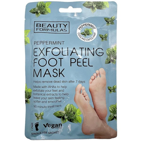 Lábmaszk - tisztító, hámlasztó, hidratáló és bőrpuhító, száraz bőrre ajánlott,, parabénmentes, vegán A Beauty Formulas hámlasztó lábmaszk borsmentával szakszerűen összeállított összetevői között az alfa-hidroxisav is szerepel, melynek célja, hogy lehámlassza a láb száraz és elhalt bőrét, és ezt követ