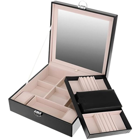 Ékszeres doboz - szintetikus bőr, nyitható, tükör, zárható, 2 szintes, 2 rekesz, mérete 25,5 × 30 × 25,5 cm (Ma×Sz×Mé), fekete kivitel A formatervezett Beautylushh ékszerdoboz ideális választás értékes ékszereid és kiegészítőid biztonságos tárolására. A műbőr biztosítja az elegáns megjelenést és a könnyű tisztíthatóságot. A zárási le