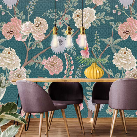 Romantikus virágmintás vlies tapéta Egy csomag 4 db 50 cm x 280 cm-es tapétacsíkot tartalmaz, melyek a megfelelő mintaillesztéssel felragasztva alkotják a 200 cm széles és 280 cm magas képet. Az elkészült tapéta panel akár önálló képként is exkluzív dekor