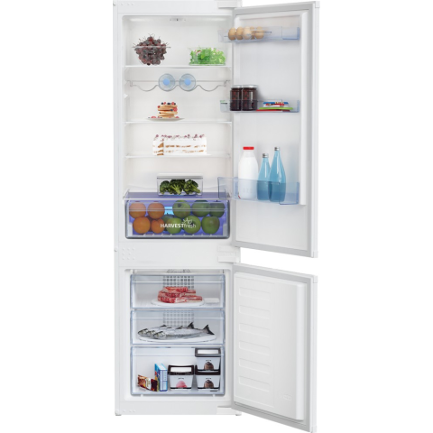 Beépíthető hűtő - kombinált (fagyasztós), energiaosztály E, hűtőtér tárolókapacitása 193 l, fagyasztótér tárolókapacitása 69 l, jobb oldali zsanéros, 4 polc, 3 fagyasztórekesz, LED világítás, nyitott hűtőajtó jelzés és 90°-os ajtónyitás, méretek 177,5 × 54 × 54,5 cm (Ma×Sz×Mé), az első díszítőpanel az ajtón nem a kiszerelés része Beko BCHA275K4SNA Semi-NoFrost Beko BCHA275K4SN beépíthető hűtőt már nem kell kézzel leolvasztanod, ugyanis magát