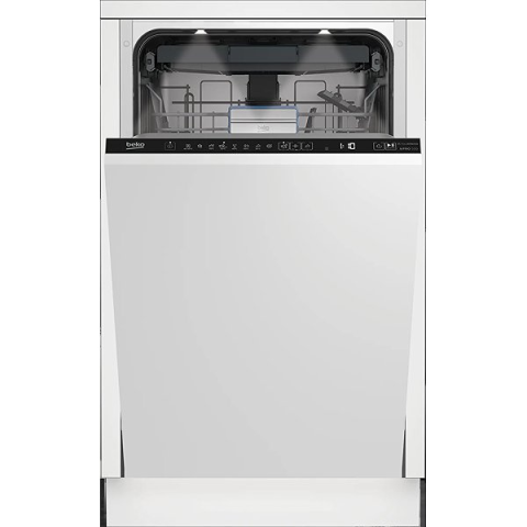Beépíthető mosogatógép - energiaosztály B, zajszint 44 dB, akár 10 étkészlet ciklusonként (ECO program), gyerekzár, túlcsordulás elleni védelem és AquaStop, érintéses vezérlés, információk kivetítése a padlóra és belső világítás, evőeszközök elhelyezése fiókba, mérete 81,8 × 44,8 × 55 cm (Ma×Sz×Mé), az első díszítőpanel az ajtón nem a kiszerelés része A BEKO BDIS38050Q beépíthető mosogatógép csúcstechnológiákat kombinál a tökéletesen tisz