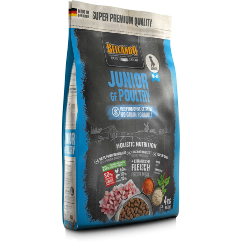 A Belcando Junior Grain-Free Poultry egy szuperprémium kutyaeledel, amely közepes- és nagytestű fajták növendék kutyáinak felnevelésére ajánlott, akik érzékenyek a gabonára - kb. 4 hónapos kortól.