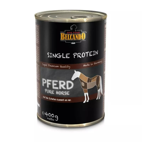 Szín lóhús 400g Magas értékű, fajtánként válogatott színhús konzerv Hat féle válogatott húsfajtában kapható, további adalékok nélkül. BELCANDO® Mix it GF-vel elkeverve kiválóan alkalmas a kizárásos diétára vagy táplálék-összeférhetetlenség esetén hosszútávú etetésre.  SINGLE PROTEIN (egy fajta fehérjés) konzervek Magas értékű, fajtánként válogatott színhús konzerv Ideális a BARF etetéshez. Kizárásos diéta esetén fehérjeforrásként is ide