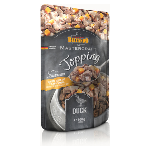 A Belcando Mastercraft Topping Duck egy friss kacsahúsból és édesburgonyából készült szuperprémium feltét, amellyel megkoronázhatjuk négylábú ínyencünk szárazeledelét, még ízletesebbé téve azt. A kutya különlegesen jól hasznosítja a húst, melyben számos aminosavon túl vitaminokat és nyomelemeket tartalmaz. Feldolgozása során igyekeznek minnél frissebben és kíméletesebben feldolgozni az alapanyagokat, így kevesebb a tápanyag veszteség, valamint nincs