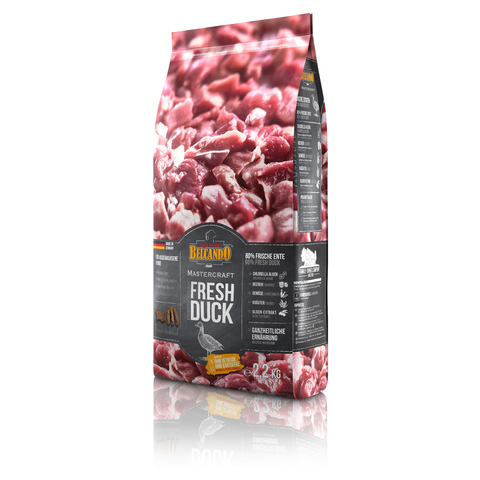A Belcando Mastercraft Fresh Duck (27/15) szuperprémium kutyatáp elkészítéséhez kizárólag friss kacsahúst használnak fel. Ez az eledel 80%-ban kiváló minőségű friss izomhúsból készül. A maradék 20%-ban olyan holisztikus összetevőket tartalmaz, mint például a klorella alga, bogyók, zöldségek, gyógynövének vagy oliva-kivonat. Gabona és burgonya nélkül készül. A minőségi és friss alapanyagoknak és azok gondos feldolgozásának hála ez a kutyaeledel ol