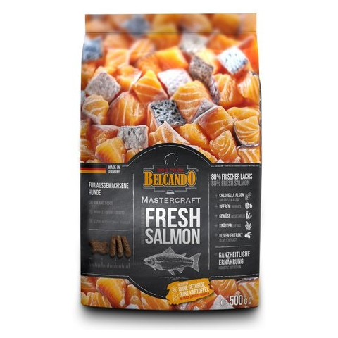 A Belcando Mastercraft Fresh Salmon (27/15) szuperprémium kutyatáp elkészítéséhez kizárólag friss lazacot használnak fel. Ez az eledel 80%-ban kiváló minőségű lazachúsból készül. A maradék 20%-ban olyan holisztikus összetevőket tartalmaz, mint például a klorella alga, bogyók, zöldségek, gyógynövének vagy oliva-kivonat. Gabona és burgonya nélkül készül. A minőségi és friss alapanyagoknak, valamint azok gondos feldolgozásának hála ez a kutyaeledel oly