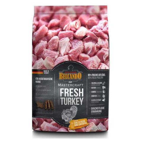 A Belcando Mastercraft Fresh Turkey (27/15) szuperprémium kutyatáp elkészítéséhez kizárólag friss pulyka- és csirkehúst használnak fel. Ez az eledel 80%-ban kiváló minőségű friss izomhúsból készül. A maradék 20%-ban olyan holisztikus összetevőket tartalmaz, mint például a klorella alga, bogyók, zöldségek, gyógynövények vagy oliva-kivonat. Gabona és burgonya nélkül készül. A minőségi és friss alapanyagoknak és azok gondos feldolgozásának hála ez a