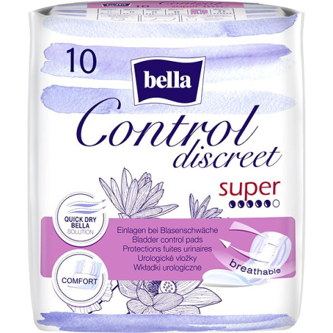 Inkontinencia betét - nőknek, super, normál és medium védelem, 245 ml abszorpció, ragasztófelülettel, légáteresztő, külön csomagolva és szagsemlegesítő, érintőréteg anyaga nem szőtt textília, 10 db a csomagban A Bella Control Discreet Super egy lélegző urológiai betét, amelyet enyhe és közepes mértékű inkontinencia kezeléséhez terveztek. A betét kiváló nedvszívó képességének és lágy, puha felül