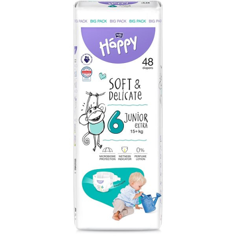Eldobható pelenka - hagyományos pelenka, méret 6, gyermek súlya 15 - 20 kg, 48 darab a csomagban, ergonómikus abszorbens mag, pelenkakiütés elleni védelem és parfümmentes, anyaga cellulóz, állatkás motívum Hogy a gyermeked elégedett legyen, szüksége van rá, hogy száraznak érezze magát. A hagyományos fajtájú Bella Happy pelenka egyáltalán nem fogja zavarni a kisbabát és megadja neki a szükséges kényelmet