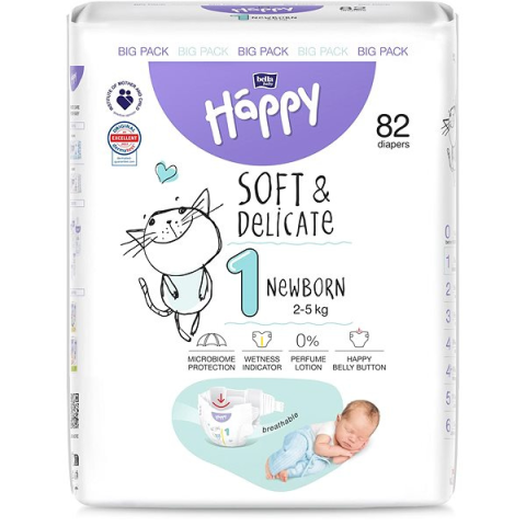Eldobható pelenka - hagyományos pelenka, méret 1, gyermek súlya 2 - 5 kg, 82 darab a csomagban, köldökcsonk kivágás, pelenkakiütés elleni védelem és parfümmentes, állatkás motívum Gyermeked elégedettsége azon múlik, hogy száraznak érezze magát. A hagyományos típusú Bella Happy eldobható pelenka nem fogja zavarni a kisbabát és gondoskodik a szükséges kényelméről. A felkínált vál