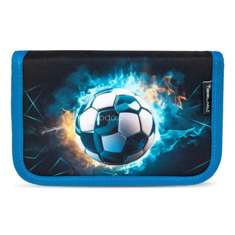 Tolltartó, klapnis, cipzáras, BELMIL Fire Footbal, fekete-kék, foci Egyrészes, 2 klapnis tolltartó rekeszek: 1 belső rekesz + 2 klapni férőhely: 27 db ceruza + 1 vonalzó + 1 radír + 1 hegyező anyag: poliészter méret: 14 x 20,5 x 3,5 cm ajánlott
