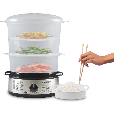 Elektromos ételpároló rozsdamentes acél aljzattal és 3 BPA mentes műanyag átlátszó tárolóval, hogy ellenőrizni tudjuk a főzés folyamatát.