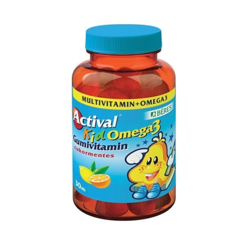 - Az Actival Kid Omega-3 gumivitamin komplex multivitamin, ami a gyerekek fejlődése szempontjából fontos DHA omega-3 zsírsavakat is tartalmaz, amelyek hozzájárulnak a normál agyműködés és látás fenntartásához.