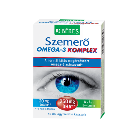A Béres Szemerő Omega-3 Komplex lágyzselatin kapszula étrend-kiegészítő készítmény DHA omega-3 zsírsavval, cinkkel, luteinnel, valamint A-, B2-, E-vitaminnal.
