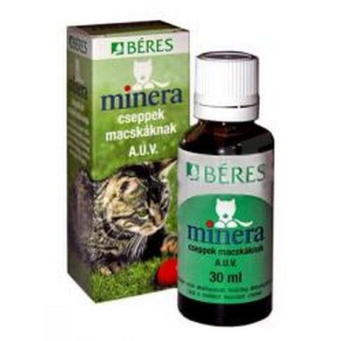 Béres Minera csepp macskának 30ml Béres csepp macskának. A Béres- és a Minera cseppek ásványi anyagokat és nyomelemeket tartalmazó készítmény. Javallat: - anyagcserezavarok, étvágytalanság, gyengeség esetén, - ellenálló képesség javítására, - bizo