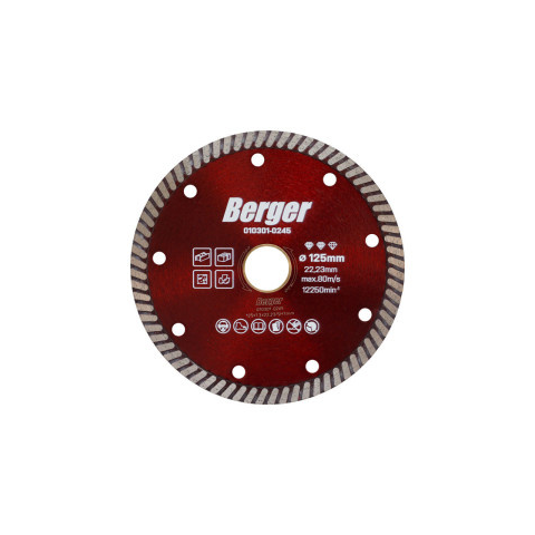 BERGER extra vékony turbo gyémánttárcsa 125x1,3x22,23/SH7mm • A TURBO A speciális bordázott mintázat gyorsabb és simább vágást biztosít, miközben elősegíti a hőelvezetést • Magas minőségű ipari-gyémánt • Magasan ötvözött szegmensek • Kemény burkólólapok, csempék vágása sarokcsiszoló gépekkel