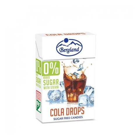 Bergland cola drops cukormentes kóla ízű cukorka 40 g Kóla ízű töltetlen cukormentes keménycukorka édesítőszerekkel. Átlagos tápérték tartalom 100 g termékben: Energia: 963 kJ/231 kcal, Zsír: 0 g - amelyből telített zsírsavak: 0g, Szénhidrát: 96,3 g -