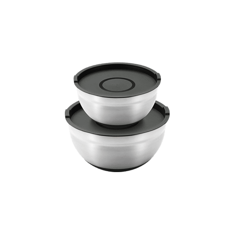 Rozsdamentes acél 4 részes tál-szett 1 db 20X11.5Cm és 1 db 24X12Cm méretű keverőtál Mérőskála a belső felületen Matt külső, fekete szilikon talp, fekete műanyag fedő.