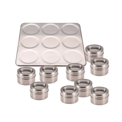 Rozsdamentes acél fűszertartó. 9db üvegcse 6.3x4.3cm méretben és egy tartó.