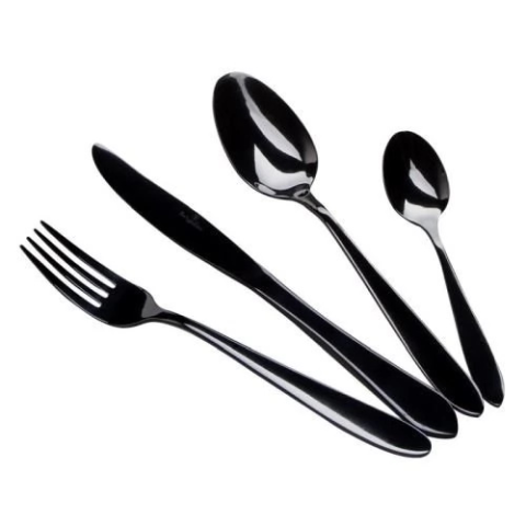 - Anyaga: rozsdamentes acél tükör fényes bevonattal    A szett tartalma:    - Étkező kés 6 db 5,0 mm   - Étkező villa 6 db 3,0 mm   - Étkező kanál 6 db 3,0 mm   - Teás kanál 6 db 2,0 mm   - Színe: fekete