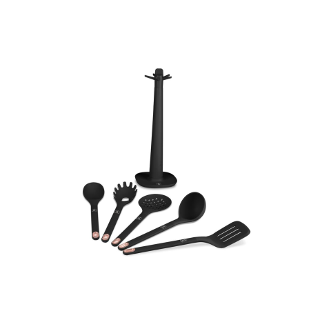 A Berlinger Haus Black Rose 6 darabos tálalószettje mindent tartalmaz, amire szükség lehet sütéshez, főzéshez vagy tálaláshoz. A konyhai eszközök prémium minőségű, hőálló szilikonból készültek, mely 230°C-ig bírja a hőt, így használatuk közben nem sértik meg a márvány- vagy teflonbevonatú edényeket.