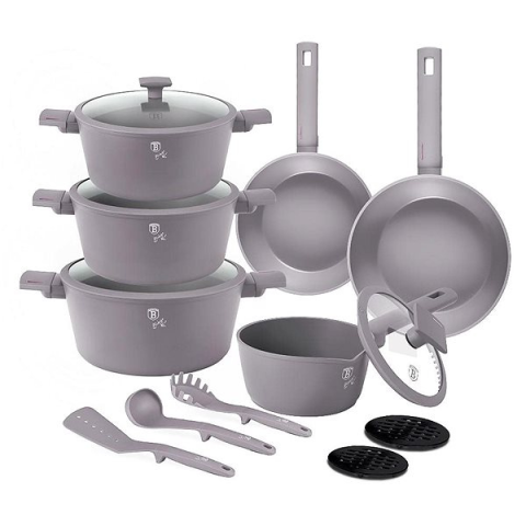 Edénykészlet - gáz, elektromos, indukciós és üvegkerámia főzőlaphoz, 4 fazék és 2 serpenyő a készletben, ergonomikus fogantyú, tapadásmentes felület és mosogatógépben mosható, edény anyaga alumínium, fazék külső felülete lakkozott, fazék belső felület Titánium, fazék nyelének anyaga szilikon, serpenyő belső felülete Titánium, serpenyő külső felülete alumínium, forgatólapát, fedő, alátét és merőkanál a csomagban, szürke kivitel The BERLINGERHAUS T