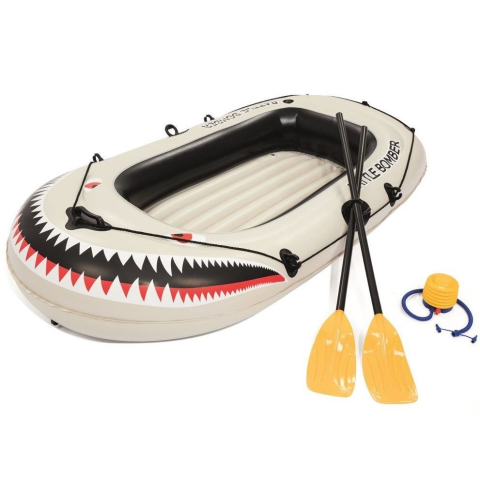 Cápás Mintás Csónak Close A felfújható csónakpadló felülete teljesen egyenletes, így növeli a stabilitást a vízen. A csónak 2 szelep segítségével gyorsan felfújható és leereszthető.Jellemzői: - maximális terhelése 120 kg - méret 1,97m x 1,15m - bi