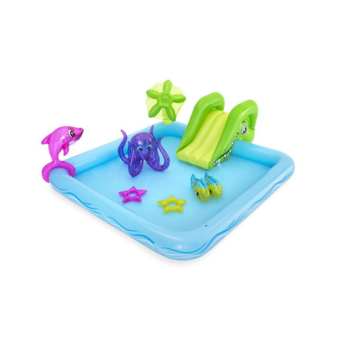 Vízi játszótér - akvárium - BESTWAY 53052Ez az akvárium formájú interaktív vízi játszótér remek szórakozást nyújt a szabad levegőn. Víz alatti kialakításával és felfújható csúszdájával és tengeri állatokkal tökéletes a nyári napokra. Bónuszként a sarkán található egy pálmafa, amiből a kerti tömlő csatlakoztatása után folyik a víz. Élénk színei és eredeti formája a végtelen szórakozásra vonzza a gyerekeket.Kültéri használat mellett méreteine