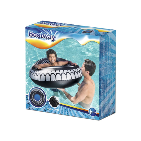 A Bestway nagyméretű, gumiabroncs alakú kereke a 12 éves és annál idősebb gyermekek nyári szórakozásához. A 119 cm átmérőjű kerékgumi két fogantyúval rendelkezik, a vízben bizonytalanok számára, és erős PVC műanyagból készült. A biztonsági szelep bizt