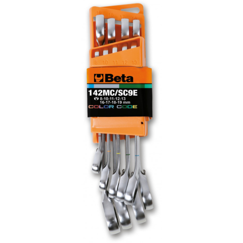 9 darabos színezett csillag-villáskulcs készlet irányváltós racsnival, kompakt tartóvalA szükséges méretű kulcs könnyen kiválasztható. • A színek gyors méretazonosítást tesznek lehetővé.