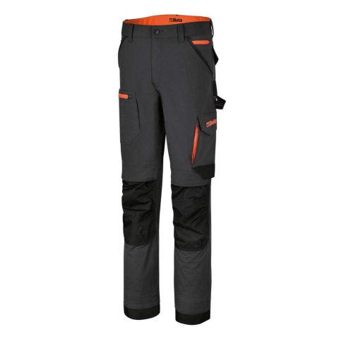 Sokzsebes elasztikus munkanadrág Anyag:• Elasztikus szövet, 90% nejlon, 10% spandex, 260 g/m2 • 600D poliészterrel erősített térdvédőzsebek, hátsózsebek és lábszárak Dizájn:• Slim fit • Elszakíthatatlan ülőrész • A magasabb hátsó derékrész jobban védi
