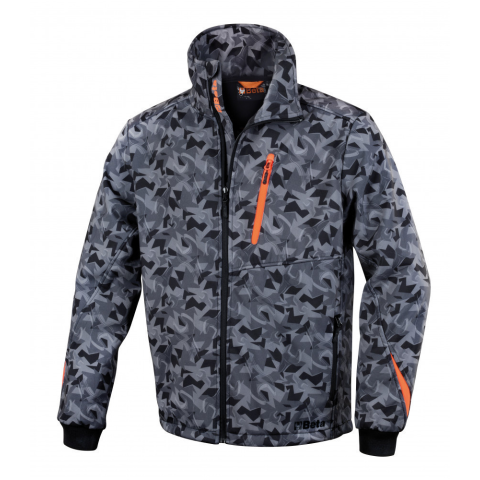 Softshell dzseki - terepszínű szürke, XL• 94% poliészter, 6% spandex, 290 g/m2,terepszínű szürke • Vízálló, szélálló, szellőző TPU membránnal (vízállóság: max. 8 000 mm, páraáteresztő képesség: 8 000 mvp)