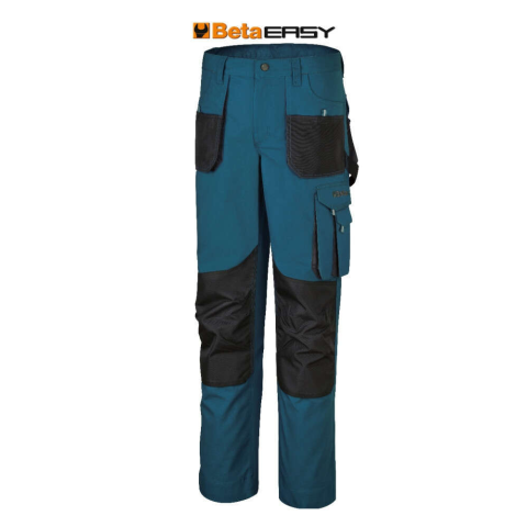 Munkanadrág Anyag:T/C vászon, 65% poliészter, 35% pamut, 260 g/m2 Dizájn:• Oxford poliészter/PU betétek és térdvédő, 220 g/m2 • Fémcipzár • Két nagy elülső zseb, tépőzáras kis szerszámos zseb • Bal száron nagy tépőzáras zseb, mobiltelefontartó zseb és