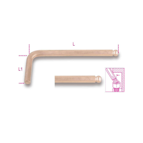 Hajlított gömbfejű imbuszkulcs, szikramentes • Réz-berillium ötvözet (CU-BE) • A Beta szikramentes szerszámokat a BAM (Szövetségi Anyagkutató és Vizsgáló Intézet) a 99/92/EC Európai Irányelvnek megfelelően tanusítja.