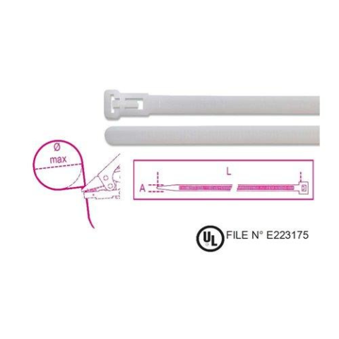 Újrahasználható műanyag kábelkötegelő szalag, natúrKérjük, a rendelésben ne a csomagok, hanem a kábelkötegelő szalagok számát adja meg Anyag: poliamid PA 6.6 + acél + szénfekete Lángállósági osztály: UL 94-V2 Működési hőmérséklet-tartomány: -40 °C ÷ +85